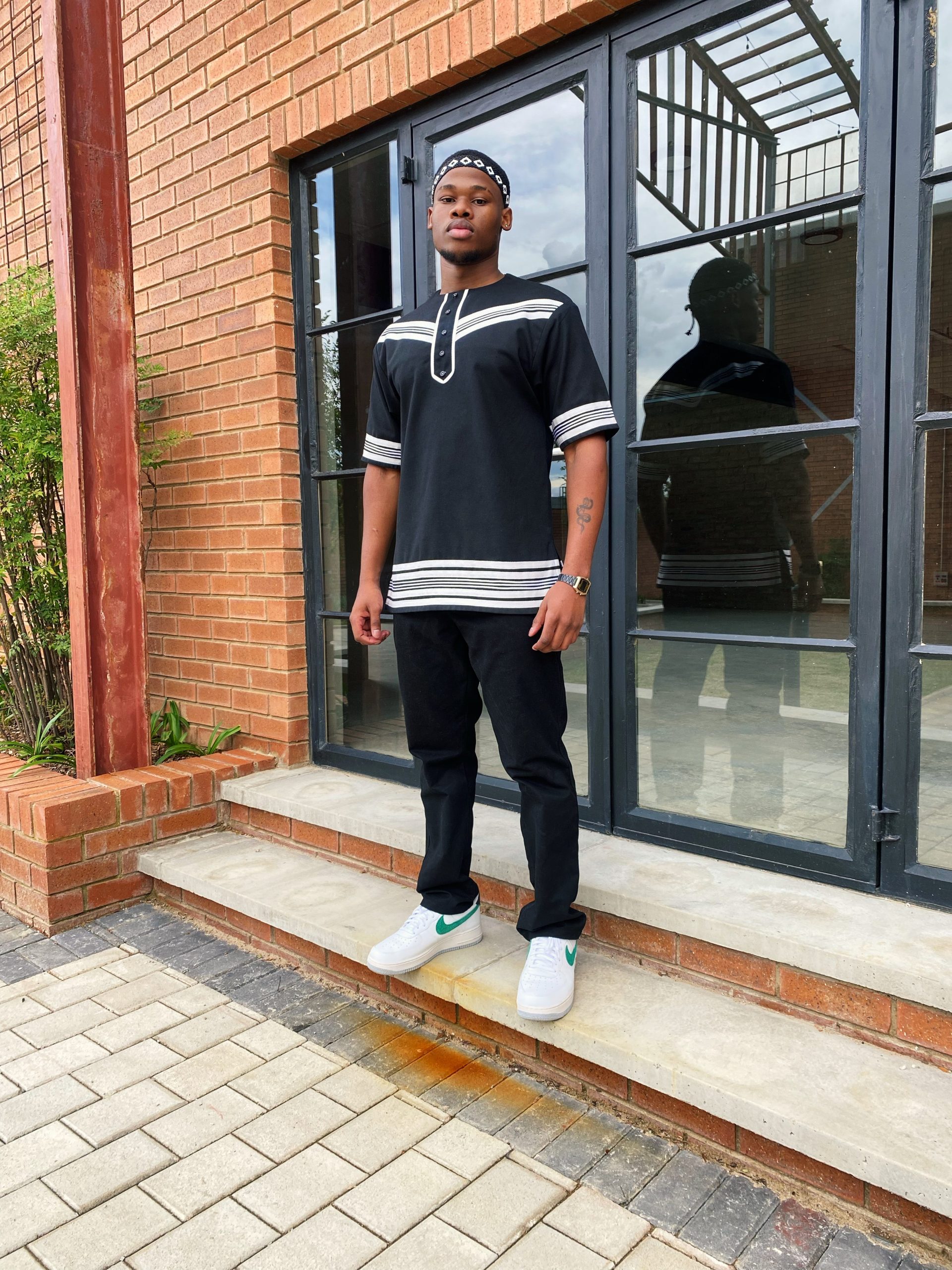 What the item is: Short sleeve shirt featuring a black and white chevron pattern.