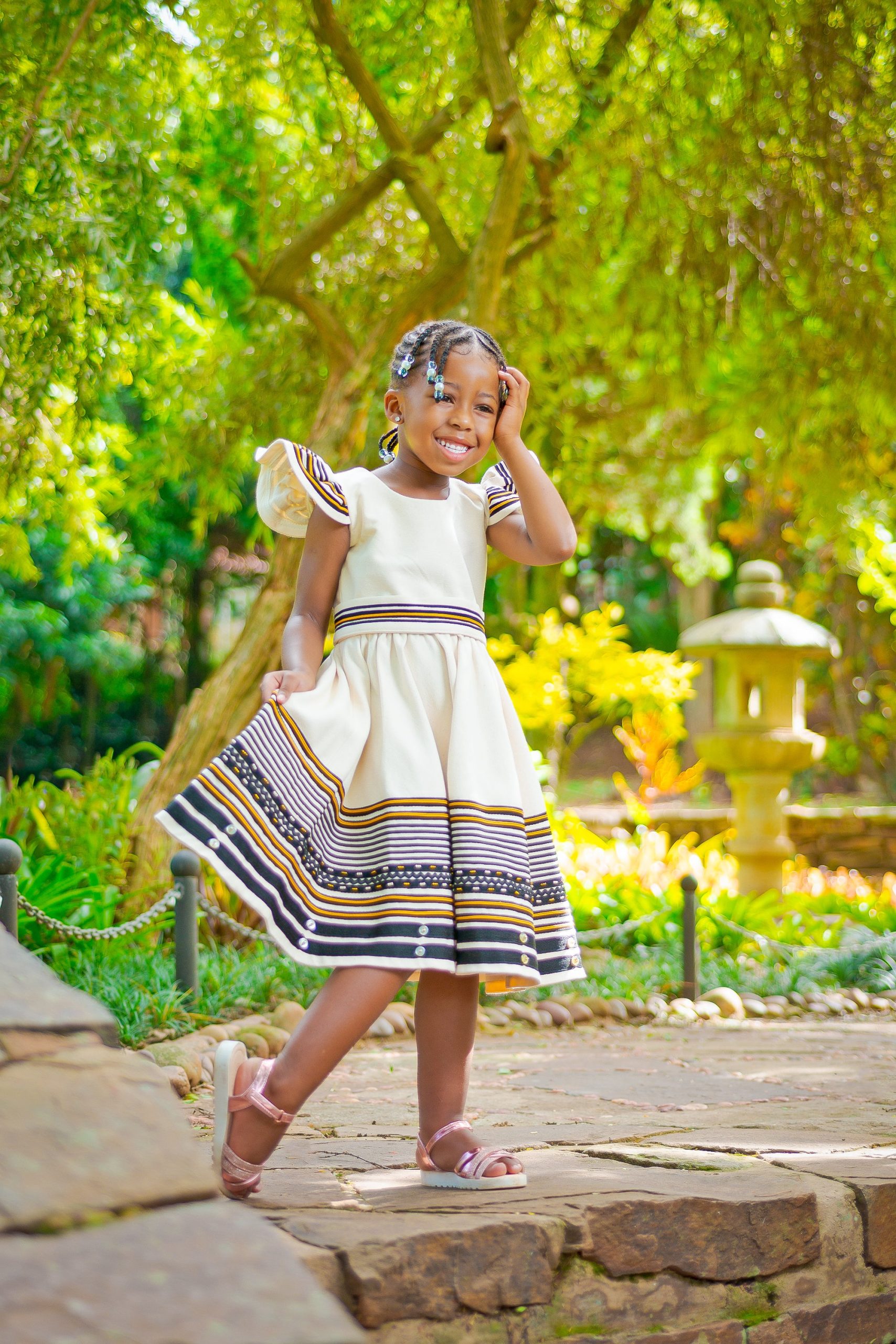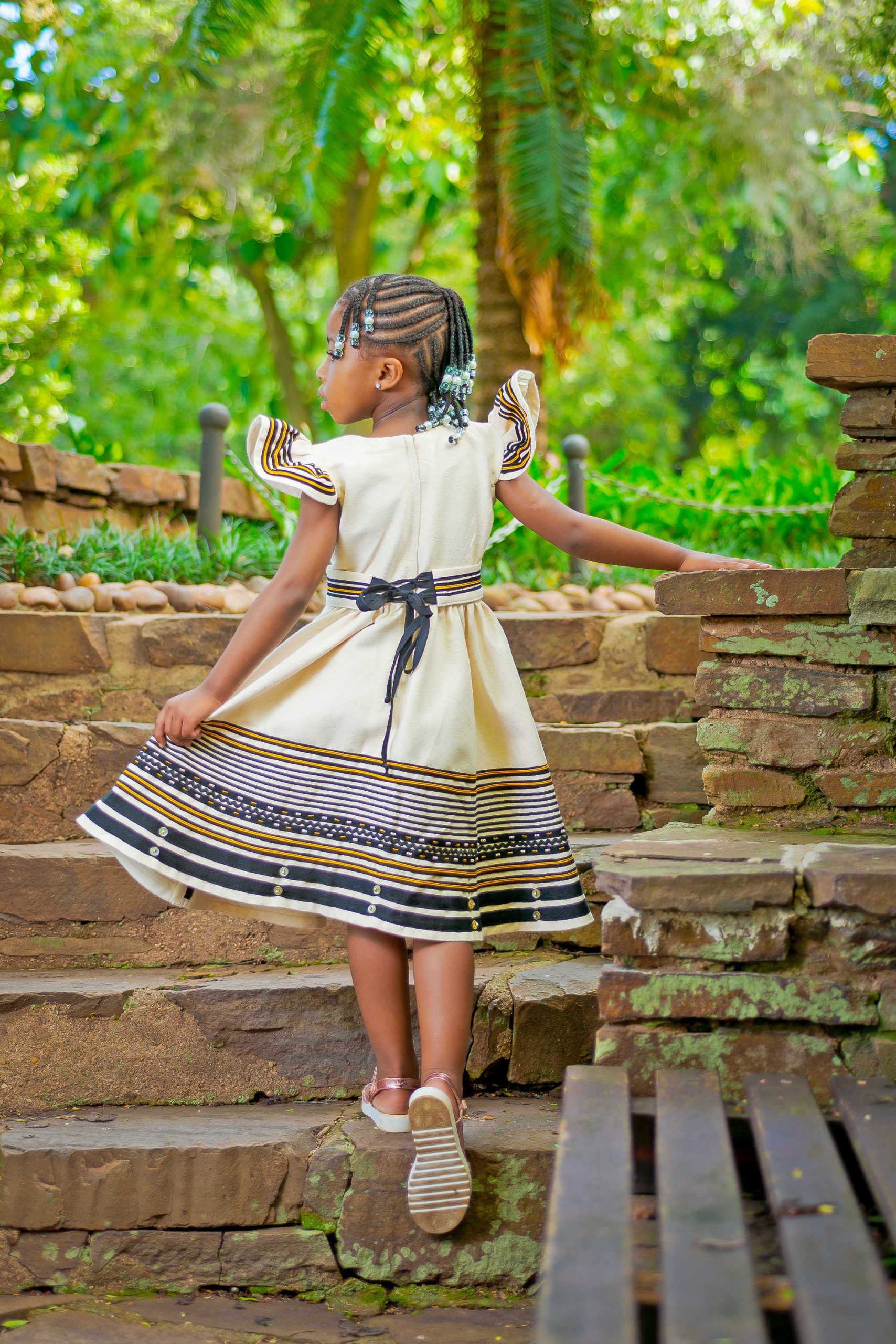 What the item is: Girls’ dress featuring a combination of cream, black, and mustard.