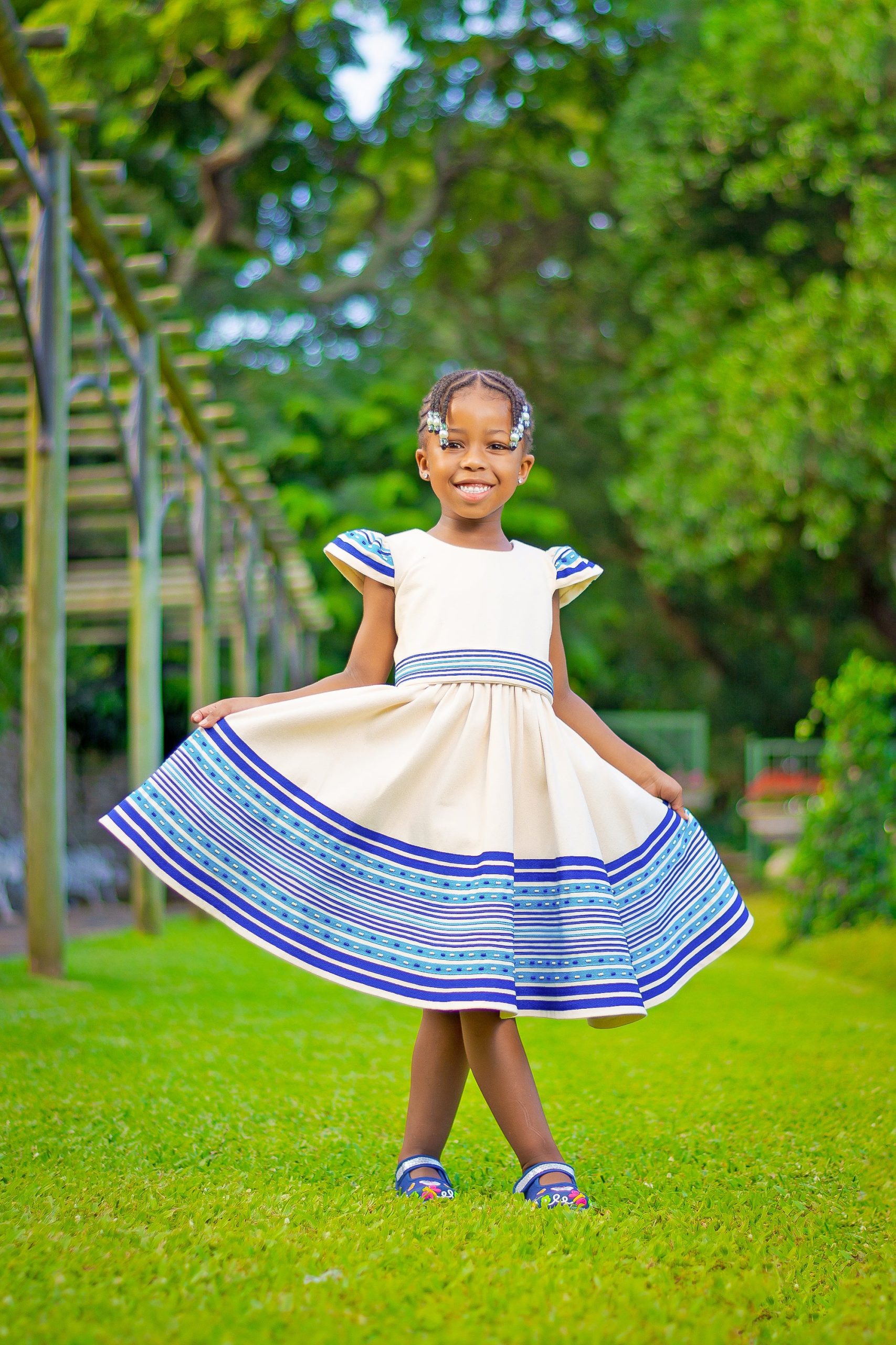 What the item is: Girls’ dress featuring a combination of cream, turquoise, and royal blue.