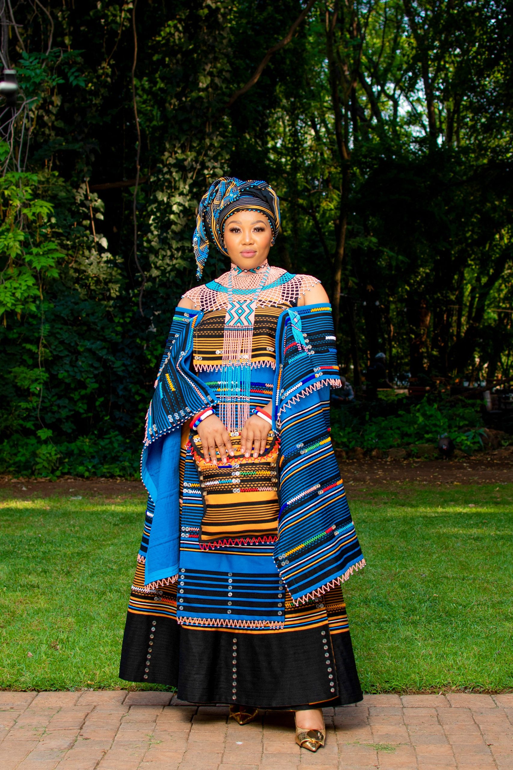 What other features: The ensemble blends mustard and turquoise for a vibrant and traditional look.