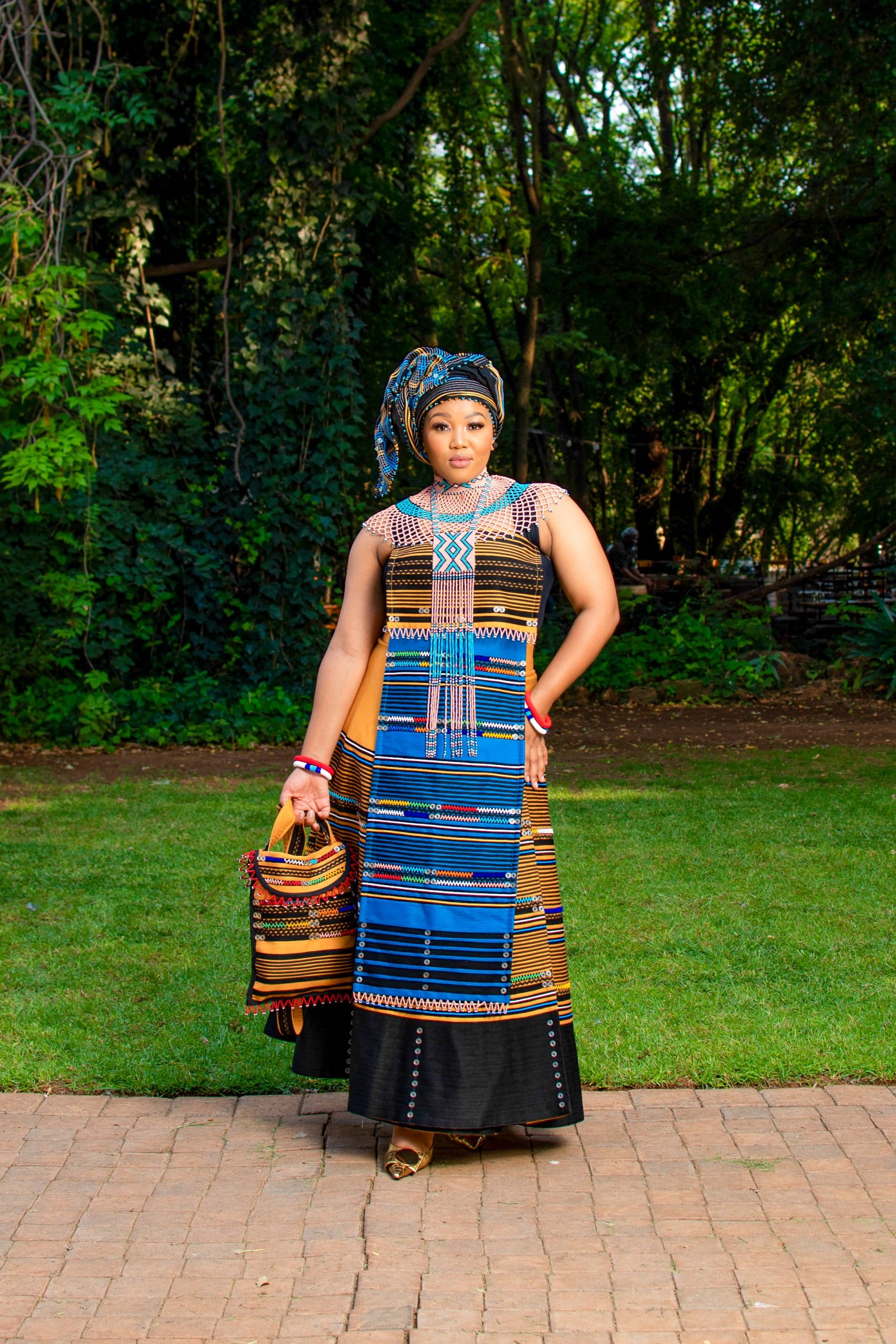 What the item is: 5-piece ladies ensemble featuring a wrap skirt, front apron, large shawl, rectangular headwrap, and matching bag.