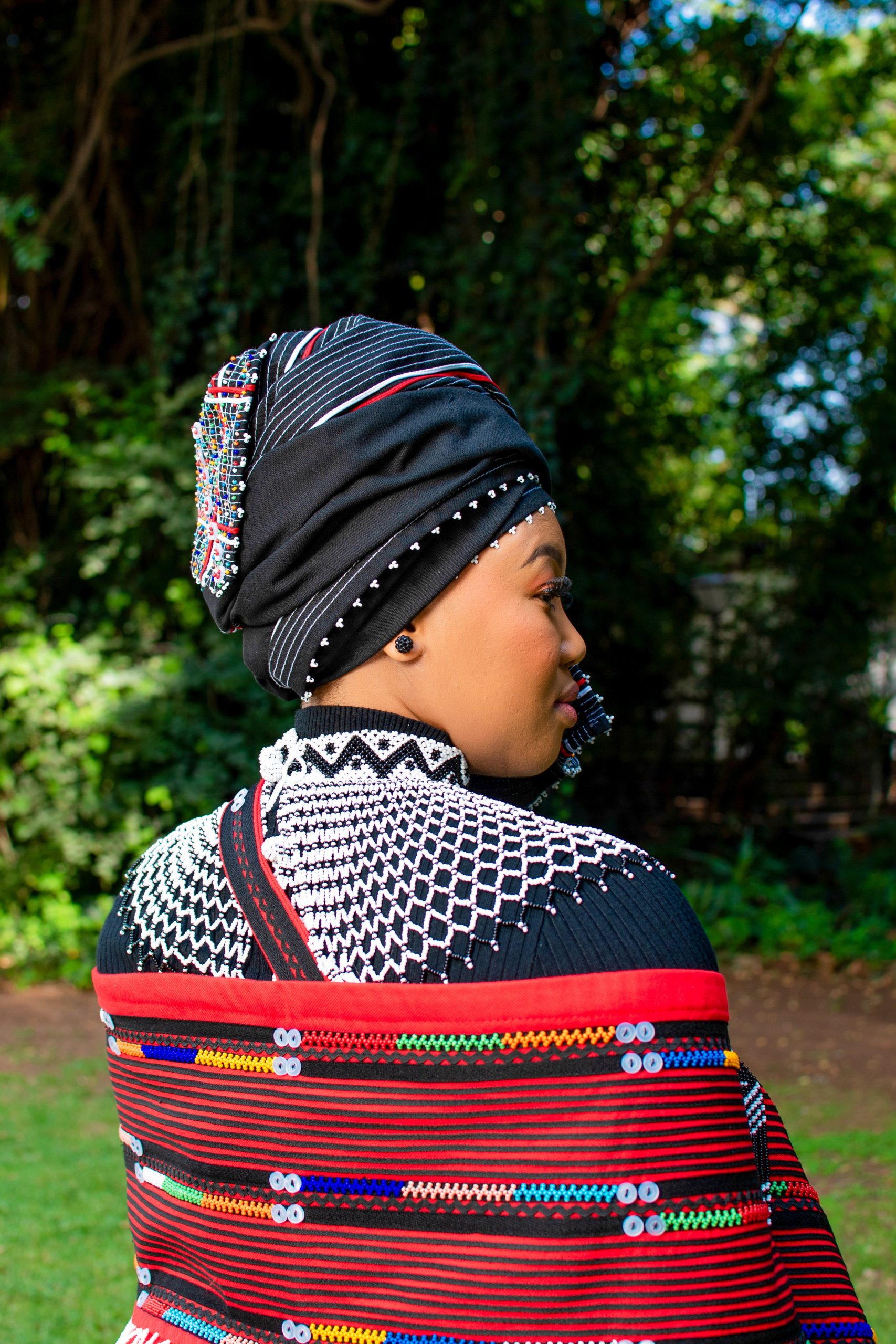 What other features: The ensemble combines striking red and black tones for a bold, traditional look.