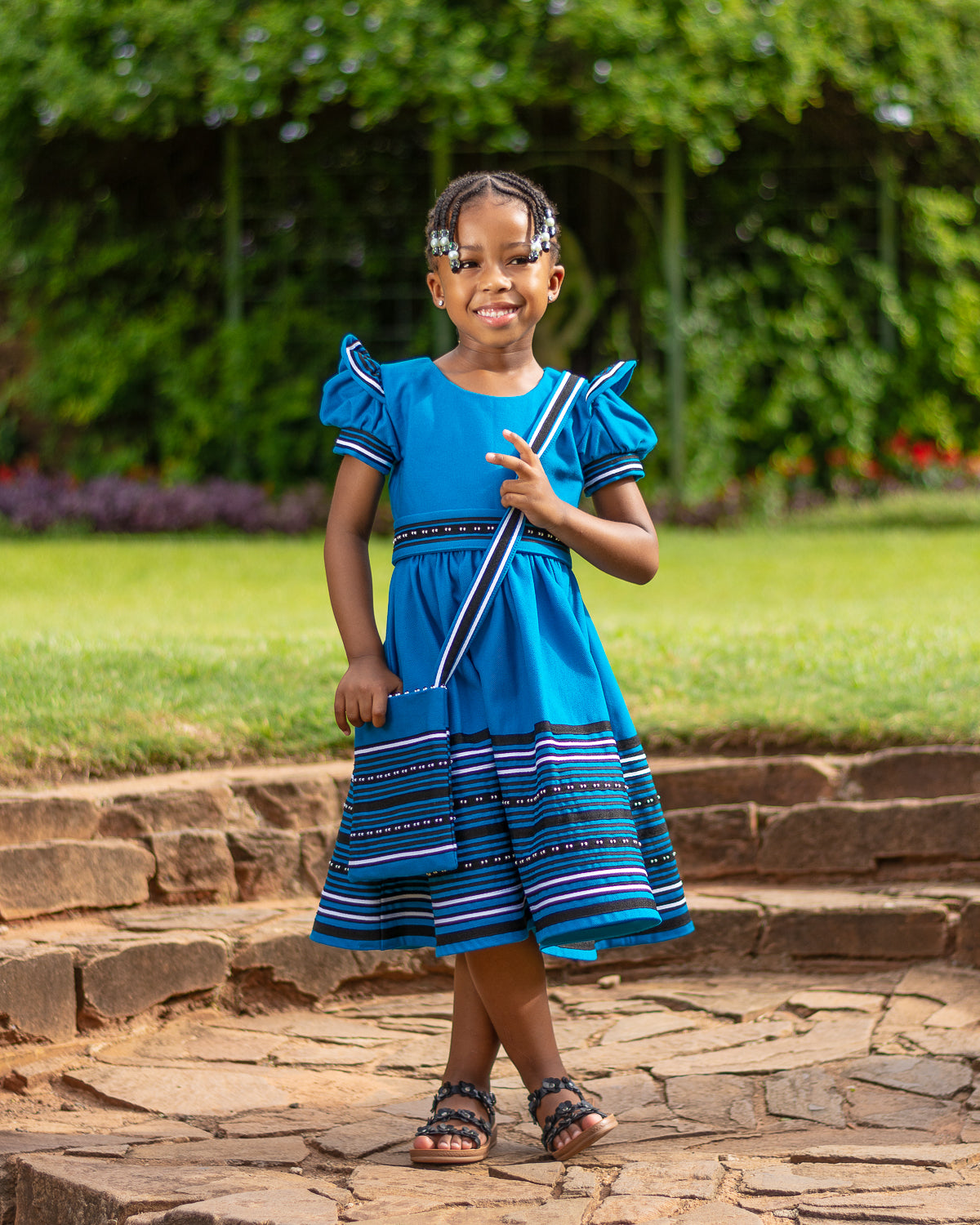 HomeUncategorizedTurquoise, black and white puff sleeve girls dress